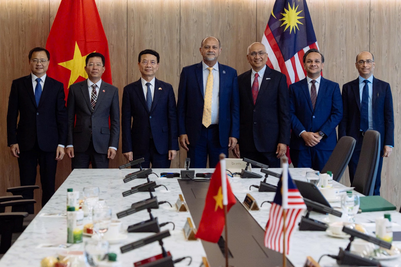 Bộ trưởng Nguyễn Mạnh Hùng và Bộ trưởng Bộ Phát triển số Malaysia YB Gobind Singh Deotại buổi làm việc.