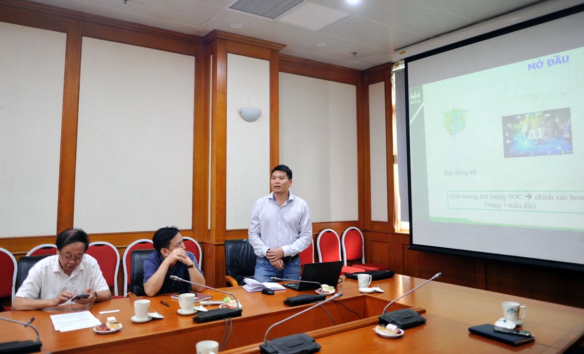 Tại phiên họp, TS. Nguyễn Thanh Tuấn – Chủ nhiệm đề tài đã trình bày tóm tắt nội dung và kết quả nghiên cứu. Theo đó, đất là bể cacbon trên cạn lớn nhất trên Trái đất, trong đó cacbon hữu cơ chiếm tỷ lệ lớn. Những thay đổi nhỏ của cacbon trong đất có thể gây ra những thay đổi quan trọng đối với lượng cacbon trong khí quyển, ảnh hưởng đến tiềm năng nóng lên trên toàn cầu. Bên cạnh đó, cacbon trong đất đóng vai trò quan trọng đối với độ phì của đất, năng suất cây trồng và chu trình cacbon toàn cầu. Do đó, việc xác định chính xác hàm lượng cacbon hữu cơ trong đất, sự phân bố của chúng trong không gian có ý nghĩa quan trọng đối với thực tiễn quản lý đất đai. Đây là cơ sở quan trọng nhằm xác định tiềm năng cung cấp tín chỉ cacbon của các vùng sản xuất nông nghiệp ở nước ta. Đối với mẫu đất (quy mô điểm), hàm lượng cacbon trong đất được xác định bằng phương pháp đốt khô, đốt ướt và phương pháp quang phổ. Đối với quy mô vùng, sự phân bố cacbon trong đất được xác định bằng phương pháp gán giá trị, địa thống kê, phương pháp học máy.