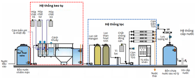 Sơ đồ Hệ thống lọc nước nhiễm mặn tại Trường tiểu học Thạnh Hải, huyện Thạnh Phú, tỉnh Bến Tre.