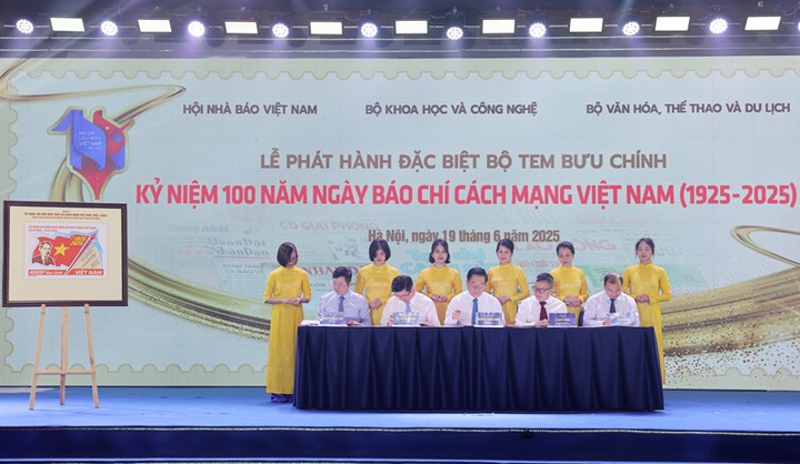 Các đồng chí Lãnh đạo thực hiện nghi thức phát hành đặc biệt bộ tem Kỷ niệm 100 năm Ngày Báo chí cách mạng Việt Nam (1925-2025)