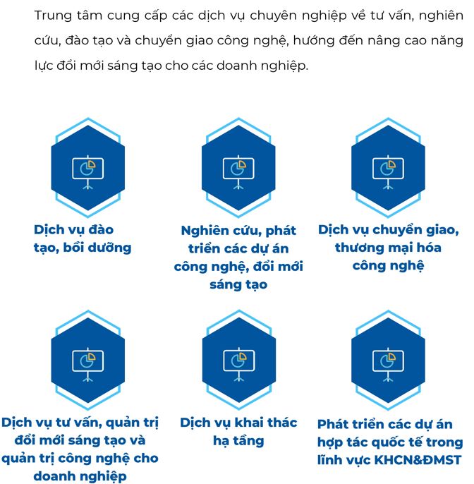 Trung tâm được ra đời với một trong các sứ mệnh giúp doanh nghiệp, tổ chức tận dụng cơ hội, đầu tư công nghệ để phục vụ sản xuất, trong đó chức năng quan trọng của chúng tôi là chuyển giao công nghệ, kết nối cung cầu công nghệ giữa các nhà phát minh, các sáng chế và tổ chức, cá nhân có nhu cầu cải tiến công nghệ, quy trình vận hành.